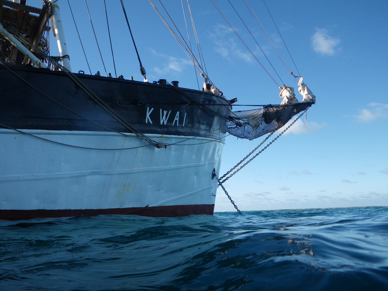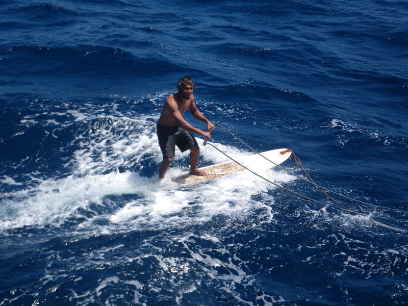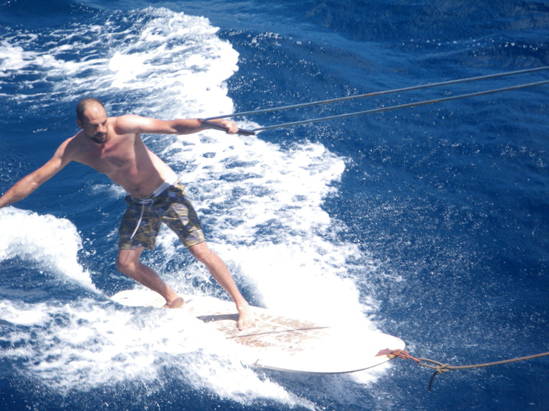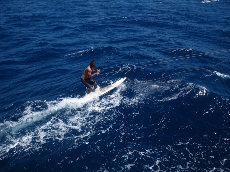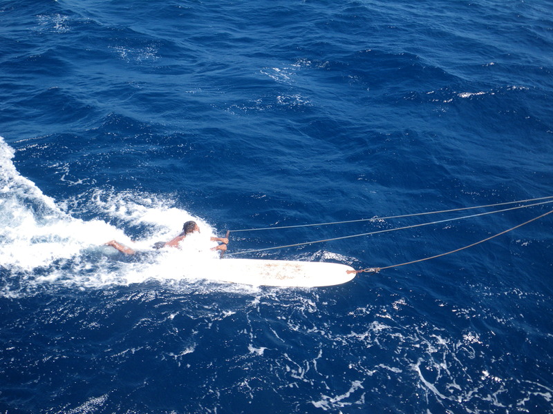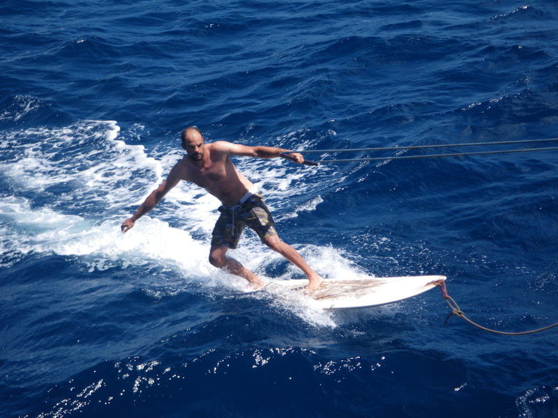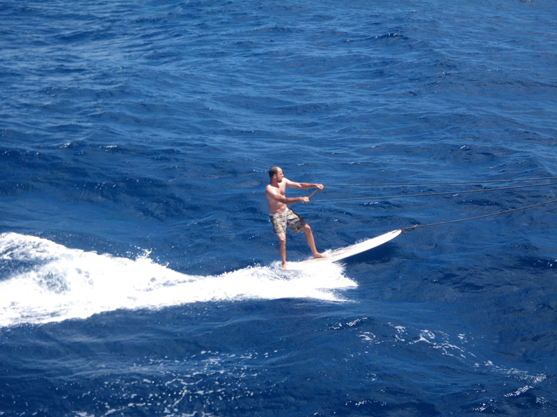 The Kwai has a tradition of surfing off the side of the ship. This is somewhat similar to wakeboarding. The ship goes about 5-7 knots, which makes for an exciting ride.