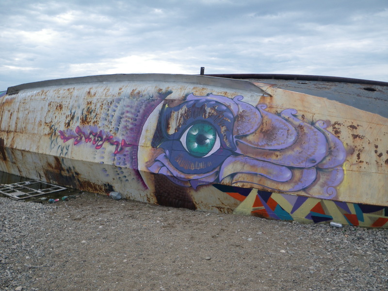 Along the shore of the lake, I found a hovercraft, and also a shipwreck that had been painted to resemble a fish.