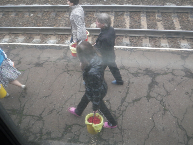 Here are people selling berries on the train platform. I did not buy the berries, but from the train they looked like cranberries.