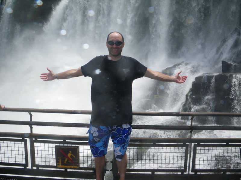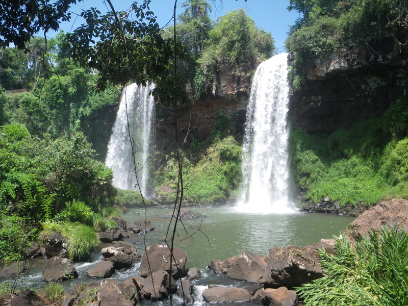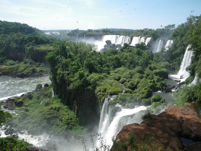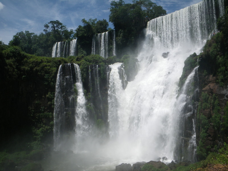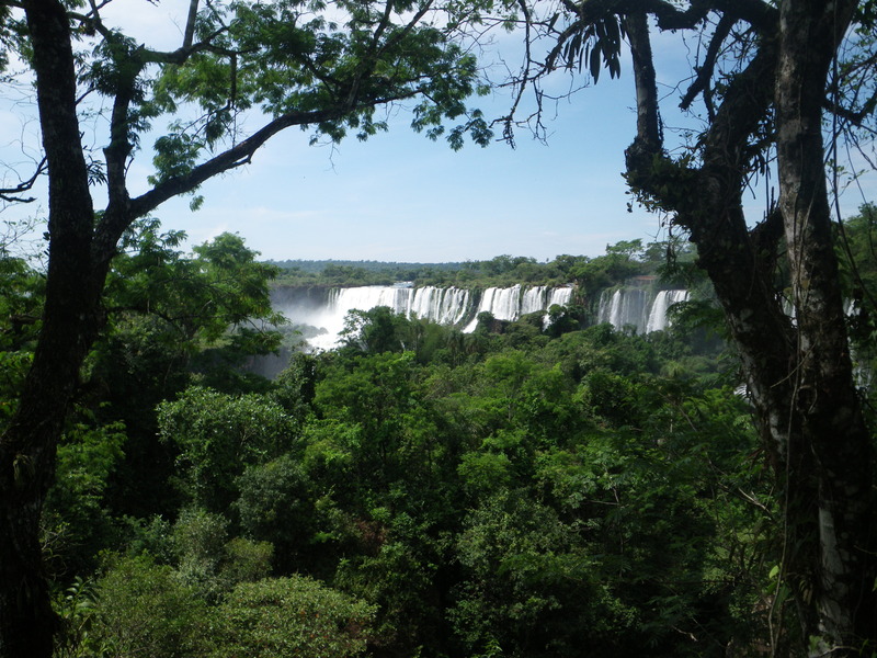 Iguazu falls are shared by Argentina and Brazil, near the border with Paraguay. The falls are wider and taller than Niagara falls, set in a beautiful rainforest that both countries have protected with National Parks.
