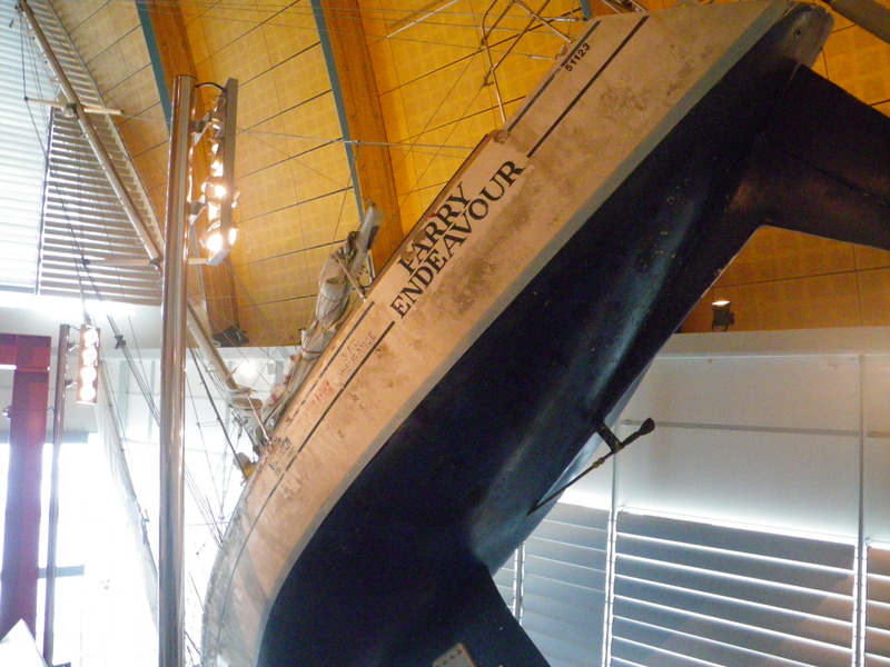 This boat, "Parry Endeavour", apparently got caught by a really big wave, so it is displayed suitably tilted.