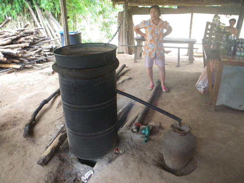The still is on the left (filled with burning charcoal), and the liquor comes out the long pipe on the right. I declined a taste, but the villagers appear to do good business on this and other tourist souvenirs.