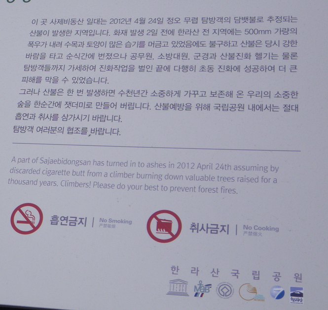 Less than a month ago, there was a small wildfire in this part of Hallasan, perhaps caused by a cigarette. The warning sign was already up.