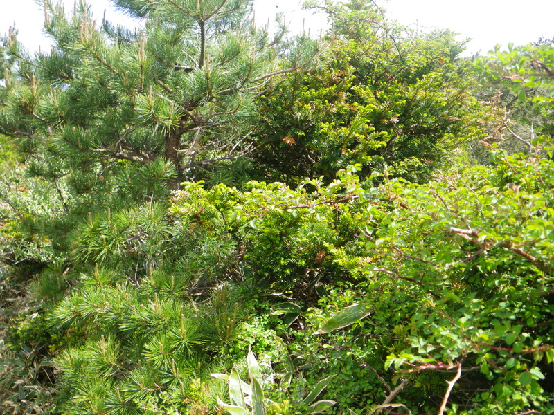 This picture shows, growing together, pine, yew, a wild rose, and bamboo grass.