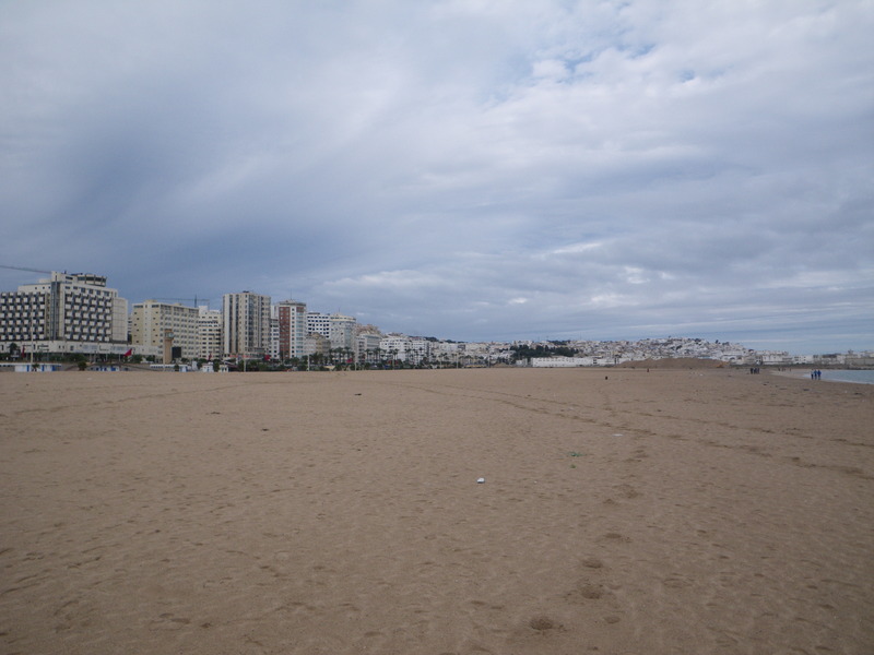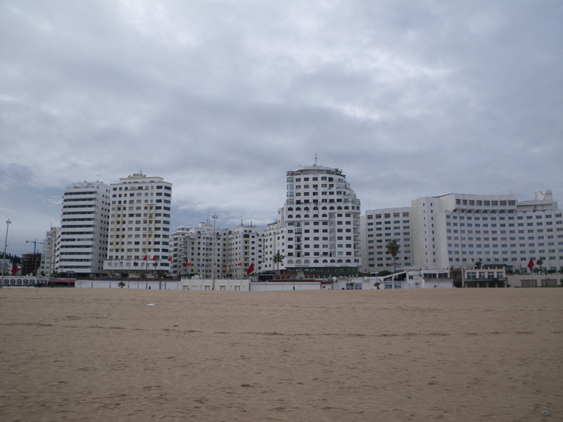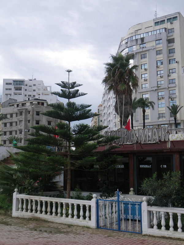 Tangier has a nice beach, with good views of Spain across the Straits of Gibraltar. The hotels have yet to reach the same heights as Waikiki, but I did find an Araucaria (Cook pine or Norfolk pine).