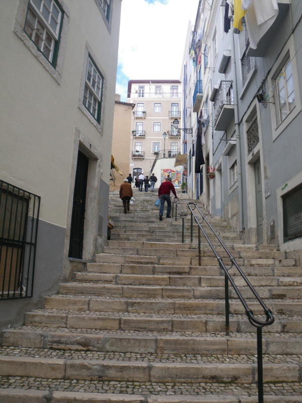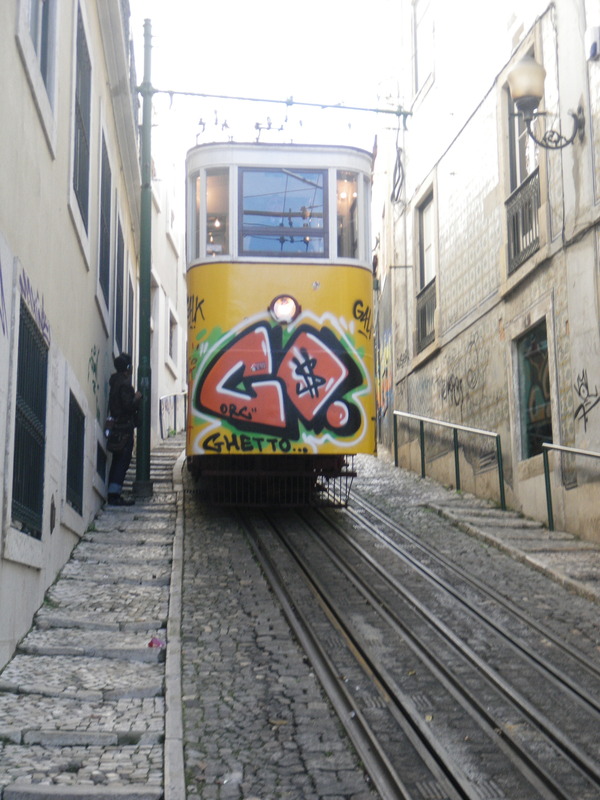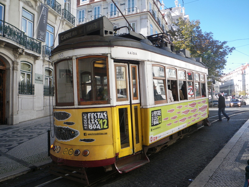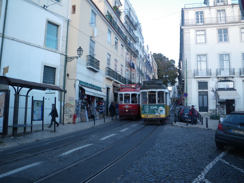 Lisbon has a wonderful variety of public transportation vehicles. The trams are famous, many of them yellow. Line 28 goes through Alfama past the Cathedral and up to the Castle, and so is very popular with tourists.