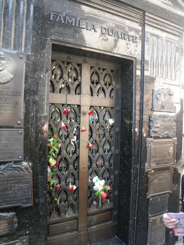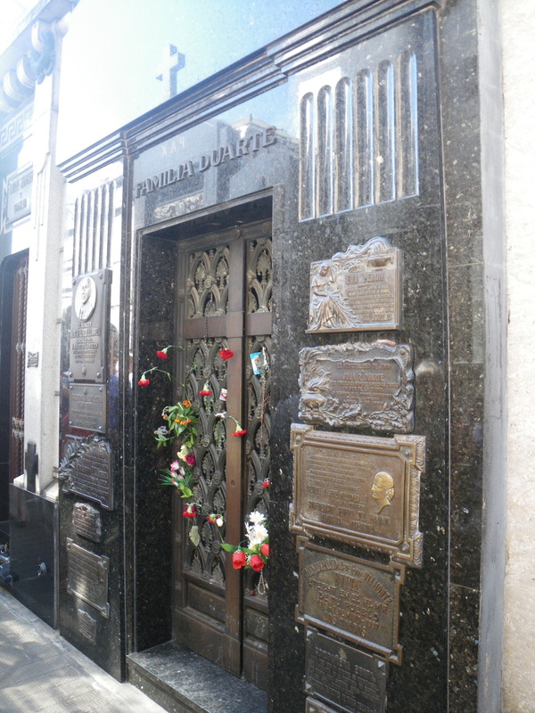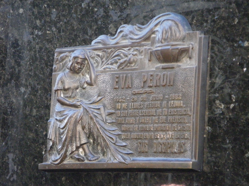 As a consequence of the wealth of the neighborhood, the cemetery of Recoleta has the tombs of many famous people, including Eva Duarte Peron, influential wife of Juan Peron, who was president of Argentina in the 1940s, 1950s, and 1970s. Eva Peron died in 1952 at the age of 33.