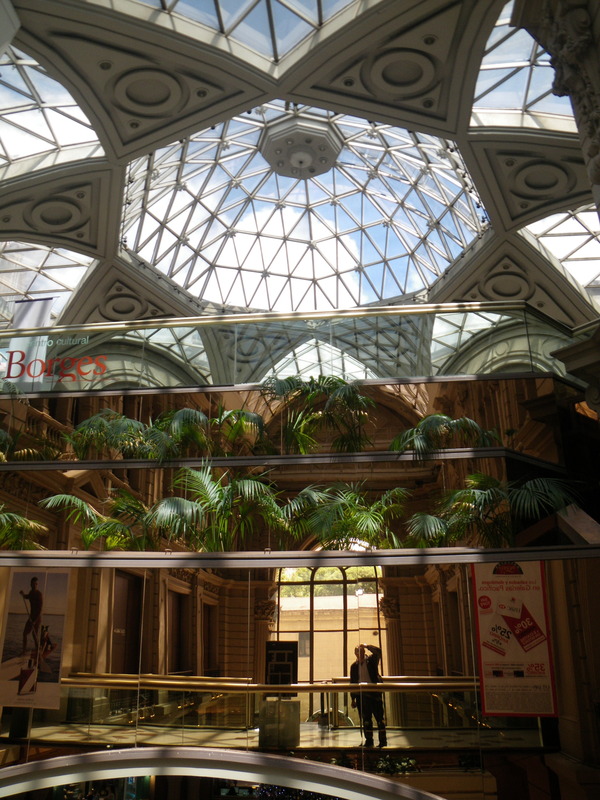 There are also some narrow streets. Downtown Buenos Aires is called the microcentro, and the main shopping street in the microcentro is Calle Florida, which is a pedestrian zone. On Calle Florida is the upscale shopping center Galeria Pacifico, with decor that includes painted ceilings.