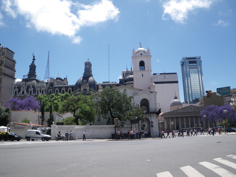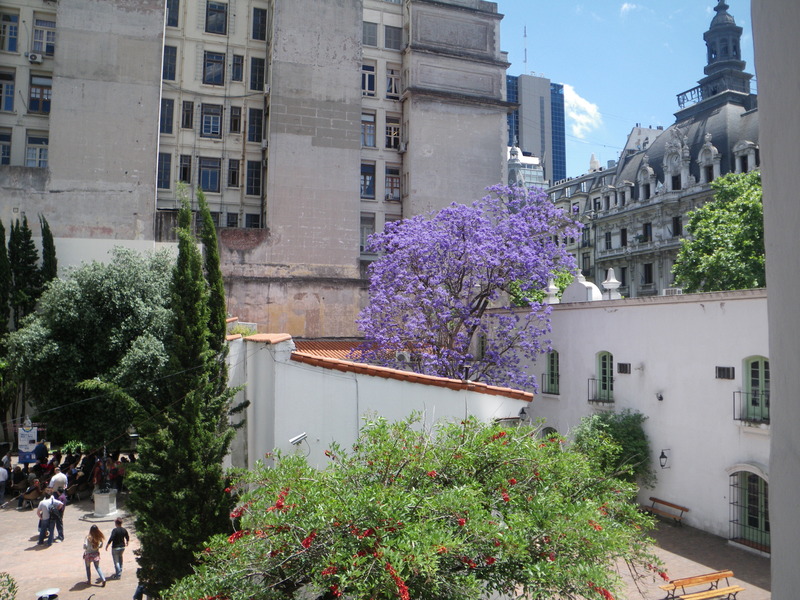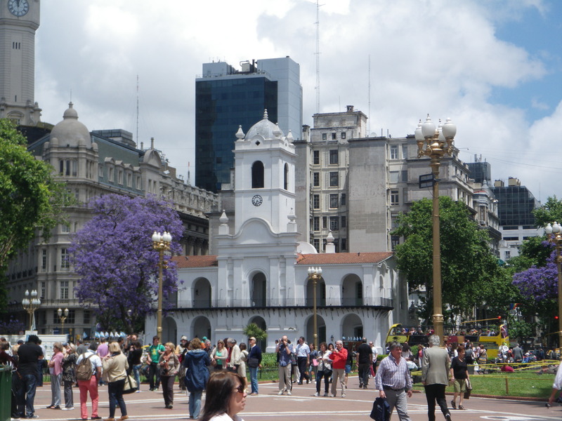 Whenever the Spanish started a new city in the New World, they built a substantial building called the Cabildo. The Cabildo served all the functions of govenment: administrative, legal, and judiciary. This is the Cabildo of Buenos Aires, with nice purple flowering Jacaranda trees around it.