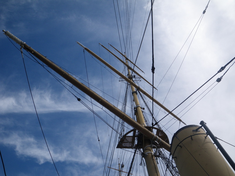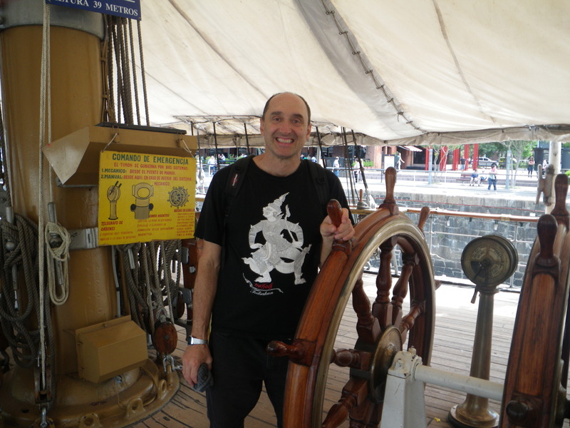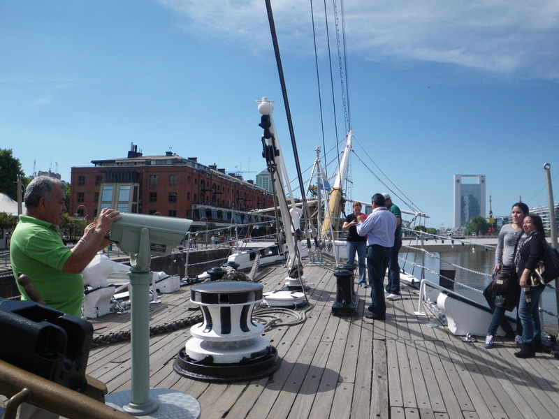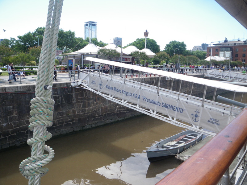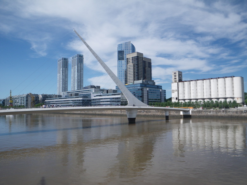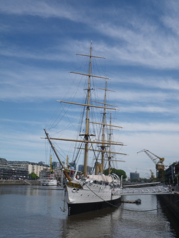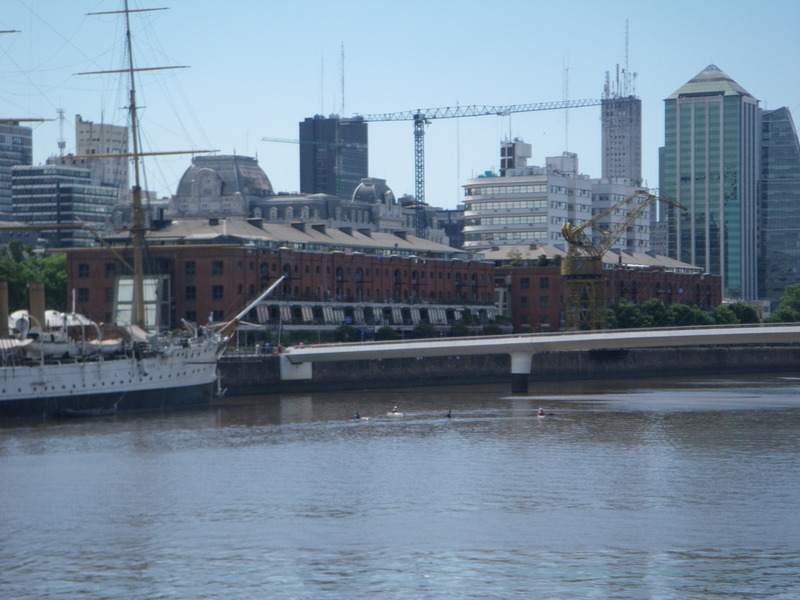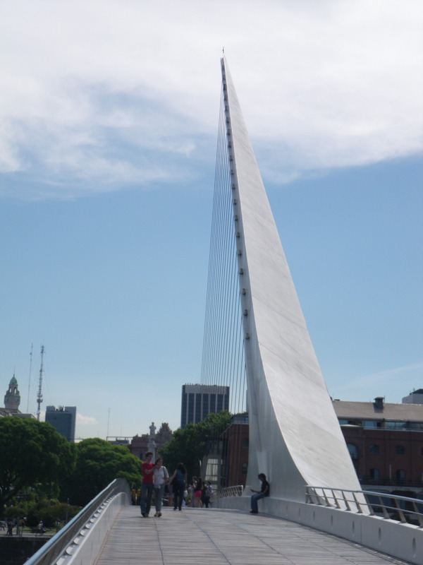 The area near the ship, Puerto Madero, is the former docklands, and has been renovated and gentrified. There is a new pedestrian bridge (Puente de la Mujer) with a fancy design, old yellow cranes, and old brick buildings that have been filled with expensive shops and restaurants.