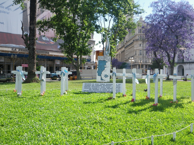 Although Eva and Juan Peron are no longer actively contributing to the political life of the country, political life in Buenos Aires still seems to be quite lively. There are many memorials and many signs about the Islas Malvinas (in English, the Falkland islands), over which in 1982 Argentina unsuccessfully fought Great Britain. Some of the signs claim that the Malvinas "were, are, and will be Argentine" ("fueron, son, y seran Argentinas"), even on the side of a food kiosk near the Reserva Ecologica.