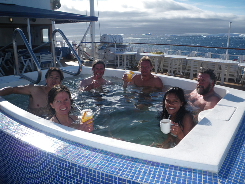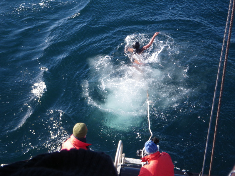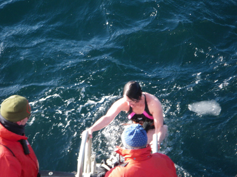 The Lemaire channel was the southernmost point we got to, at about 65 degrees South, so it was a good place for our polar plunge. I went in, and like the others, got out very quickly again. Notice the ice floating in the water in the last two pictures.