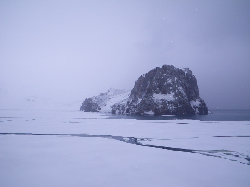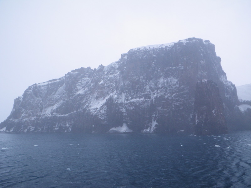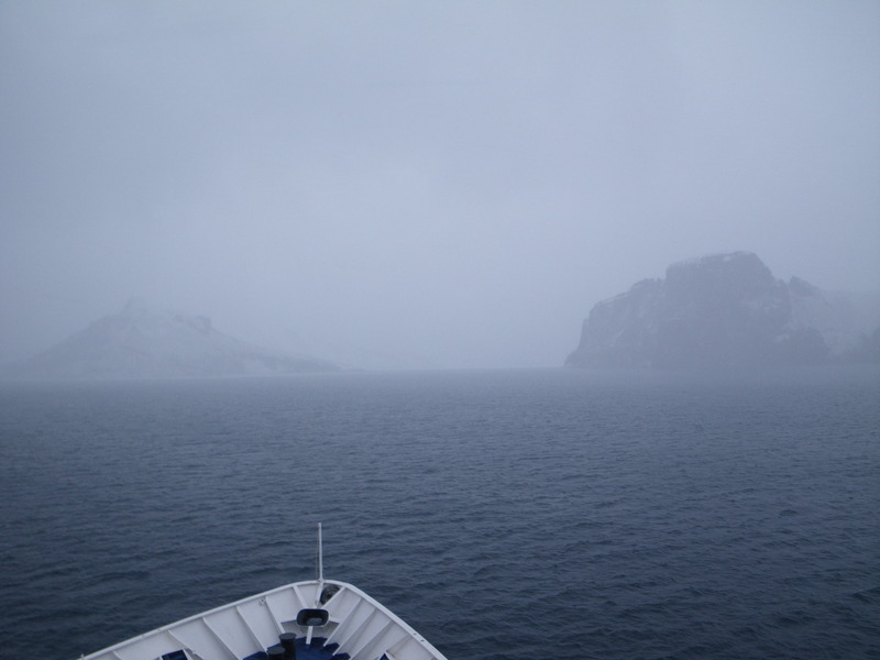 When we got to Whaler's bay, the weather was foggy and snowy, and it was hard to see the cliff to the left of the entrance, called Neptune's Bellows, until we were close. It gives me even more respect for the sailing abilities who got around this area without GPS or any of the navigational aids that we now take for granted.