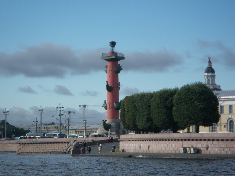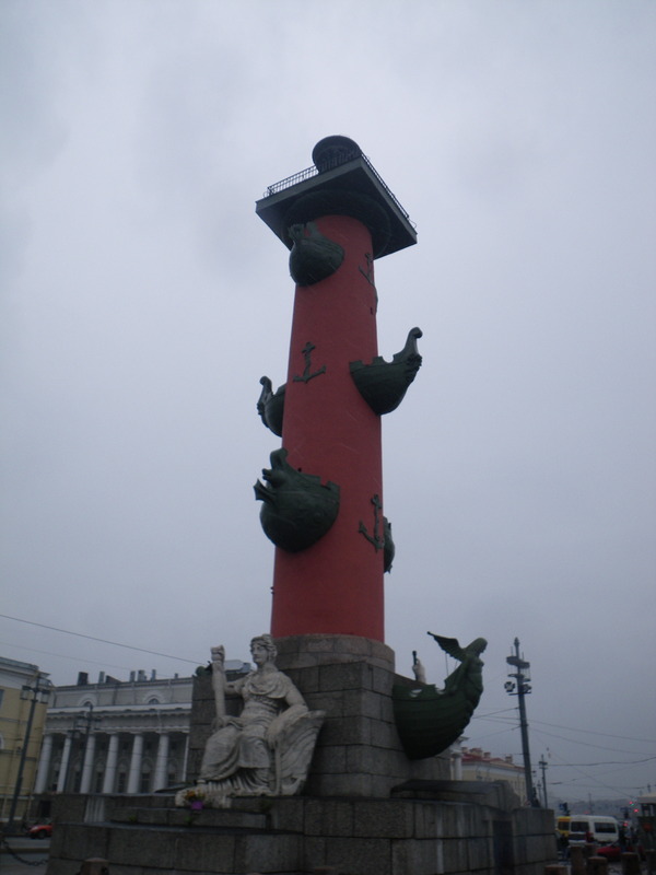 The Carthaginian fleet had reliably beat the Roman fleet, until the Romans devised a way to hook onto the enemy ship and fight the sailors as they would on land. Then, the Roman prowess prevailed, and the Romans beat the Carthaginians in 338BC. They were so proud of their victory that they permanently mounted the prows of the enemy ships. Back then, warships had a sharp and hardened prow that could be used to make holes in and sink enemy ships. Such a hardened underwater projection was called a rostrum, or rostra in the plural. The rostri were a favorite place for speakers in Ancient Rome. Somebody in 1800s St. Petersburg decided Rostral columns would be appropriate in Russia as well, though without including any actual parts of ships.