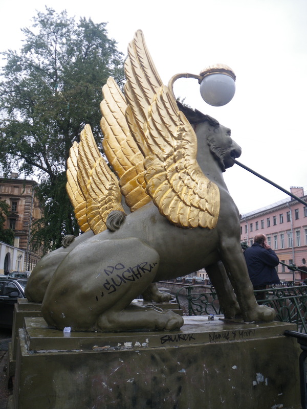 One of the pedestrian bridges over a canal is supported by cables that come out of the mouths of briffins. For some reason, a graffiti on one of the griffins says "no sugar", which is the diet I keep.