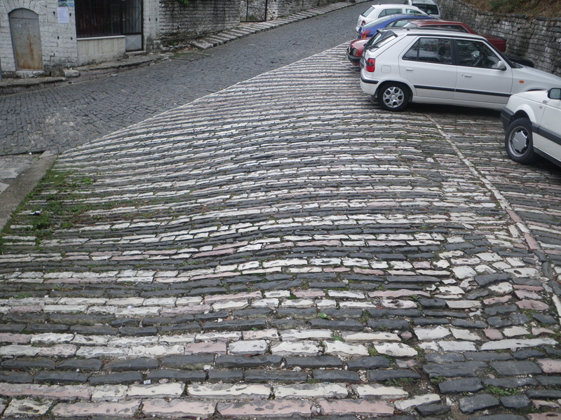 The paving stones on some of the roads are arranged in alternating white and dark stripes.