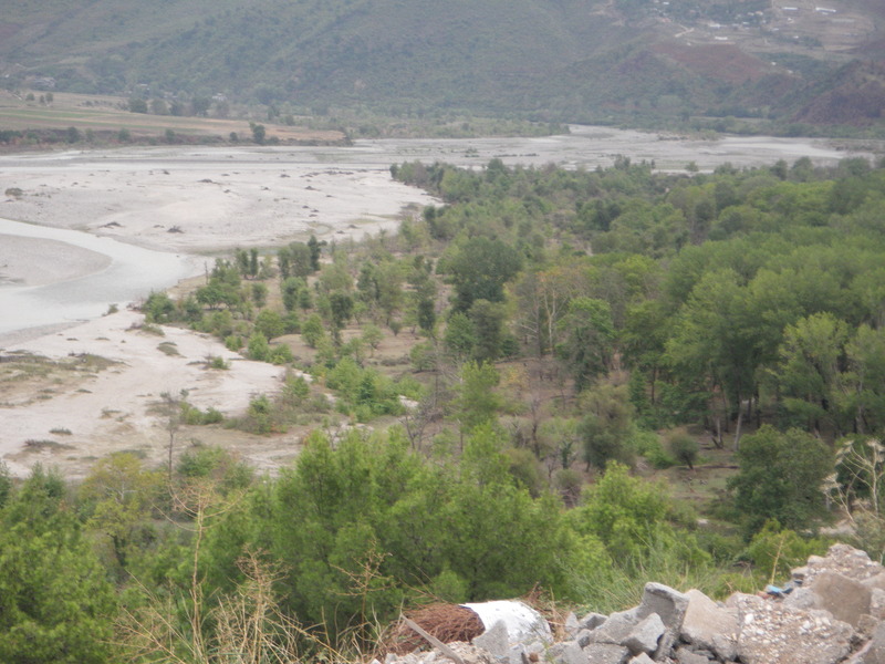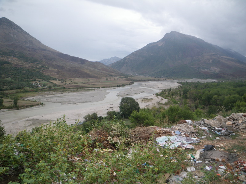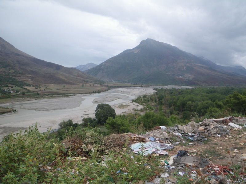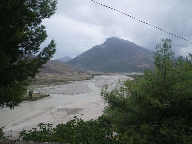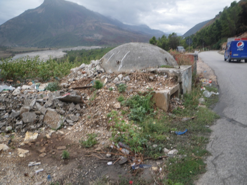 The Drino river flows into the Vjosa river at Tepeleni, birthplace of Ali Pasha Tepelena. Ali Pasha also had a castle in Tepeleni. The place where the Drino flows into the Vjosa river is dramatic, at the foot of a large mountain. The second picture also shows one of the many bunkers built by volunteers throughout Albania on the encouragement of Enver Hoxha, who thought they would be necessary for defense.