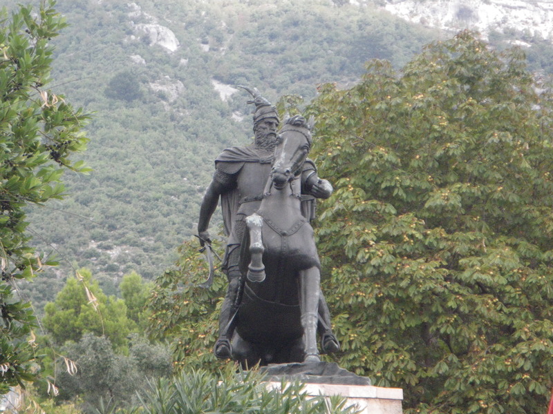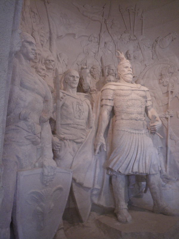In any case, modern statues of Scanderbeg generally show him with his helmet with a goat on it. The first sculpture, done in a heroic style that seems to have been popular with communist governments from Russia all the way to Albania, shows Scanderbeg at the head of his army.